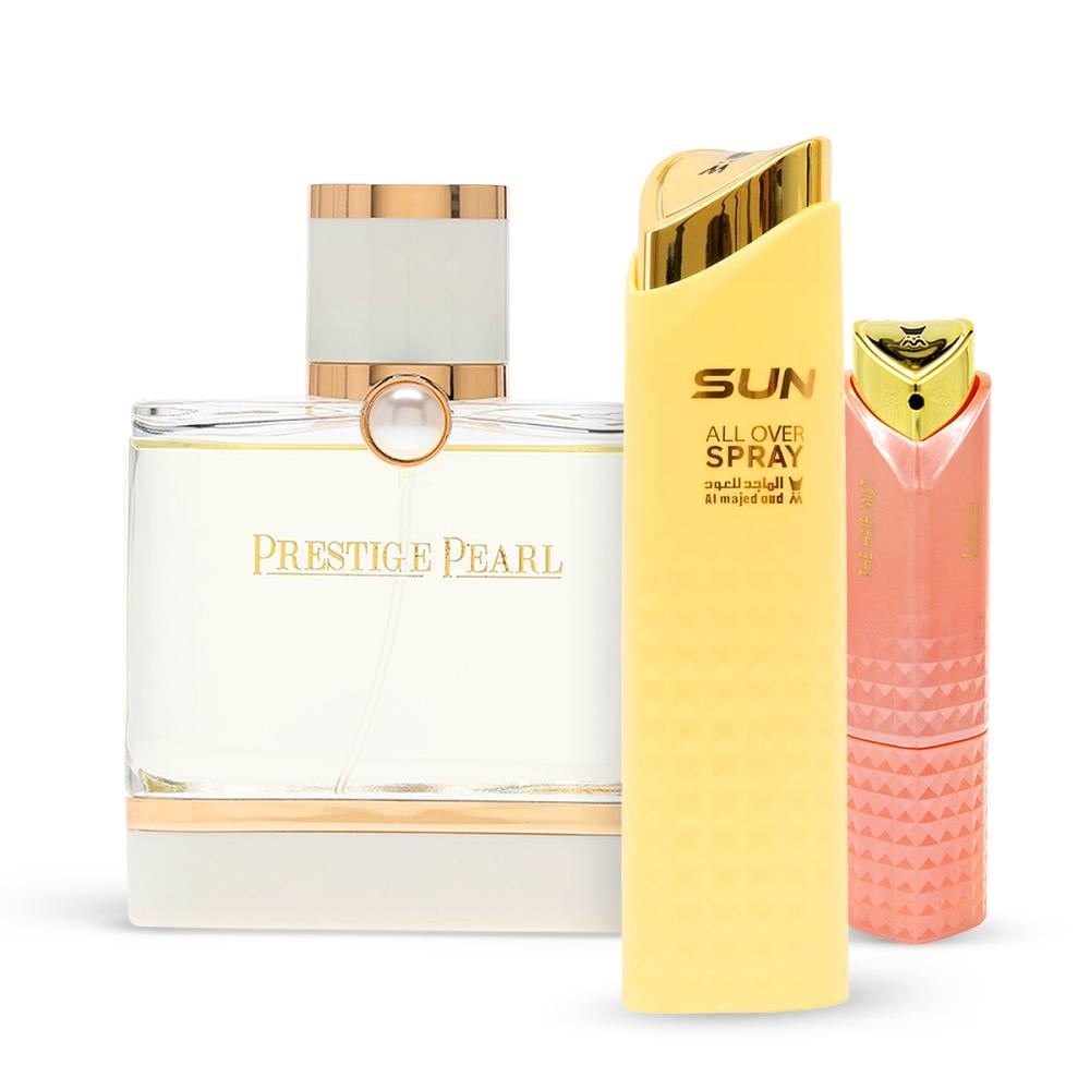 Prestige Pearl is the fragrance for every elegant woman. A spray where elegance meets beauty, it begins with refreshing notes of pink pepper, transporting you to the delicate scent of rose, full of femininity and softness, followed by the luxury of patchouli to add more depth and attraction.